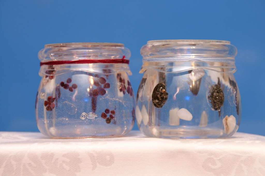 Diejenigen, die genauer hinschauen, entdecken in jedem Stück eine von Hand gedrehte Spirale und Eintrübungen, entstehend durch verarbeitete Bergkristalle.